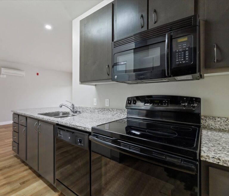 The open galley-style kitchen includes granite countertops with a breakfast bar, energy-efficient appliances, modern lighting, and a discreetly concealed full-size washer and dryer for added convenience.